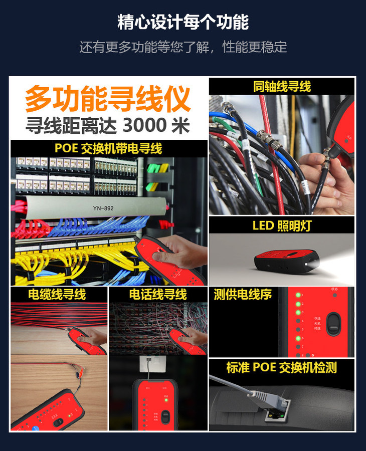 支持网络线寻线、电话线寻线、同轴线寻线、电缆线寻线等,寻线距离最长可达3000 米,满足绝大多数弱电工程需求。